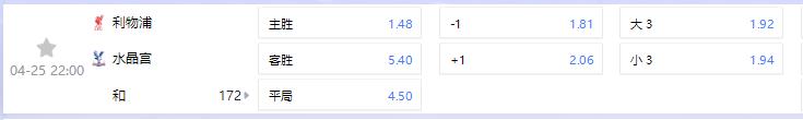 【英超】【4月25日】22:00【利物浦VS水晶宫】金币投注贴